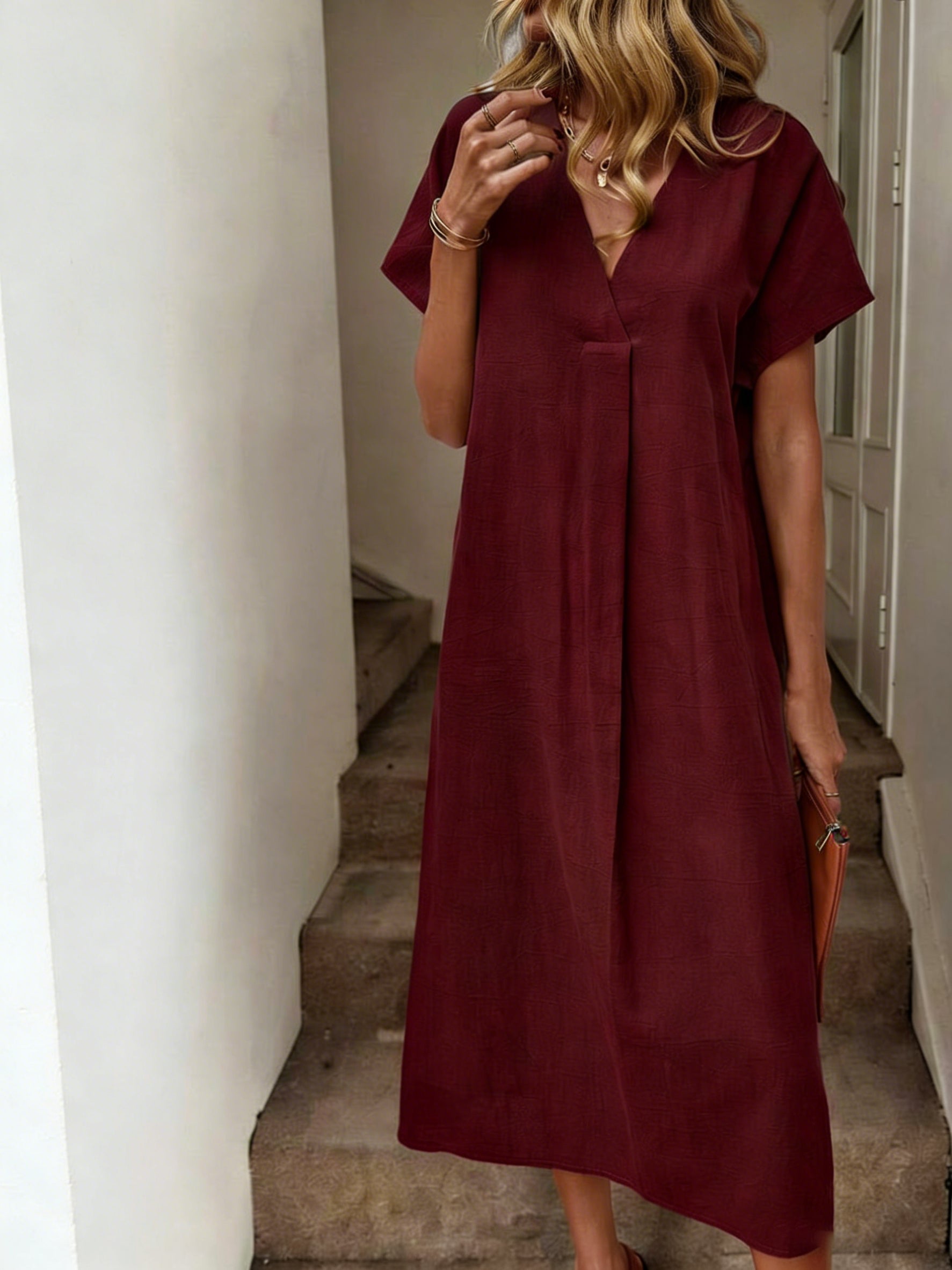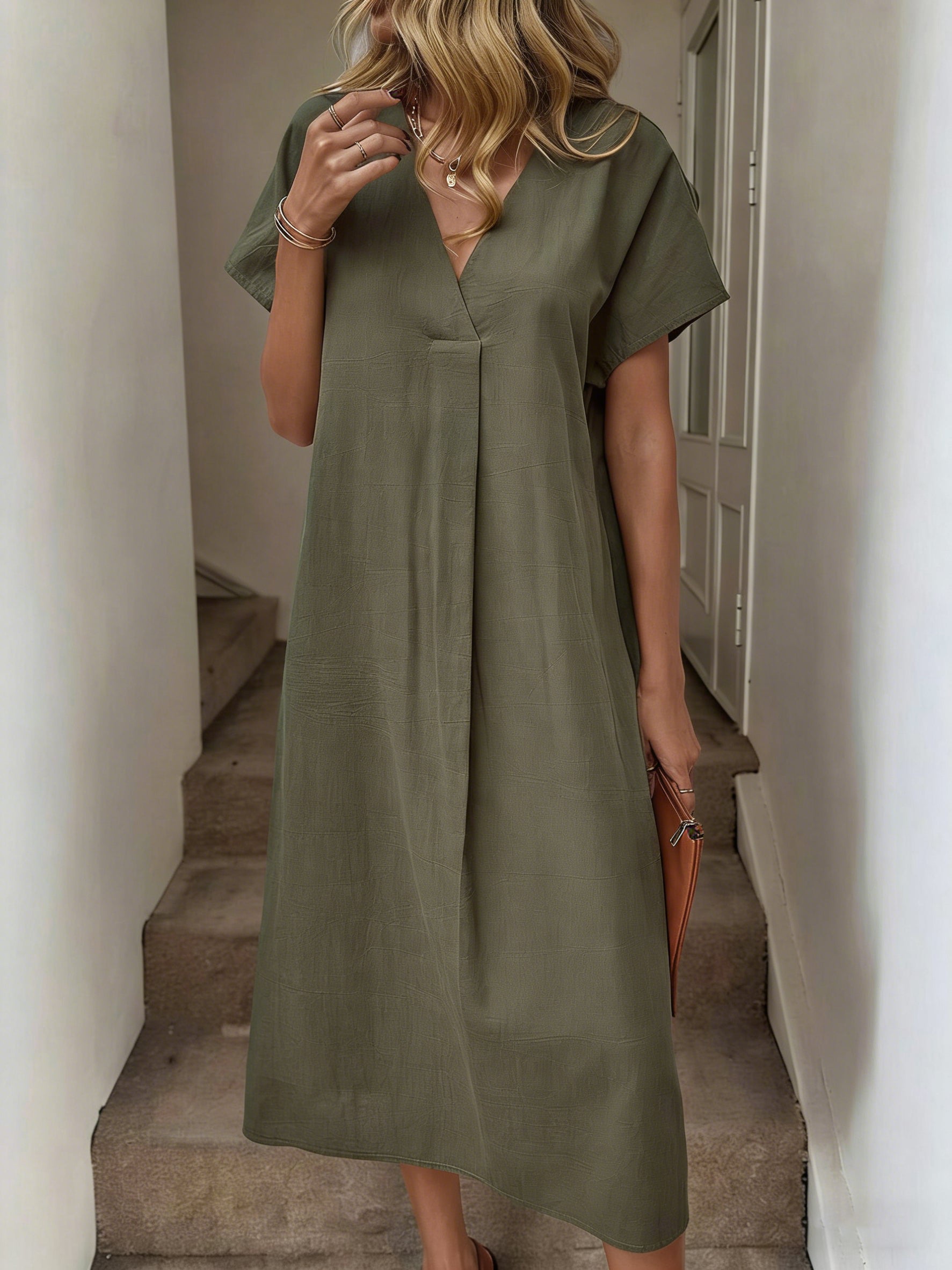 Women's Solid V-Neck Raglan Sleeve Loose Cotton Midi Dress
