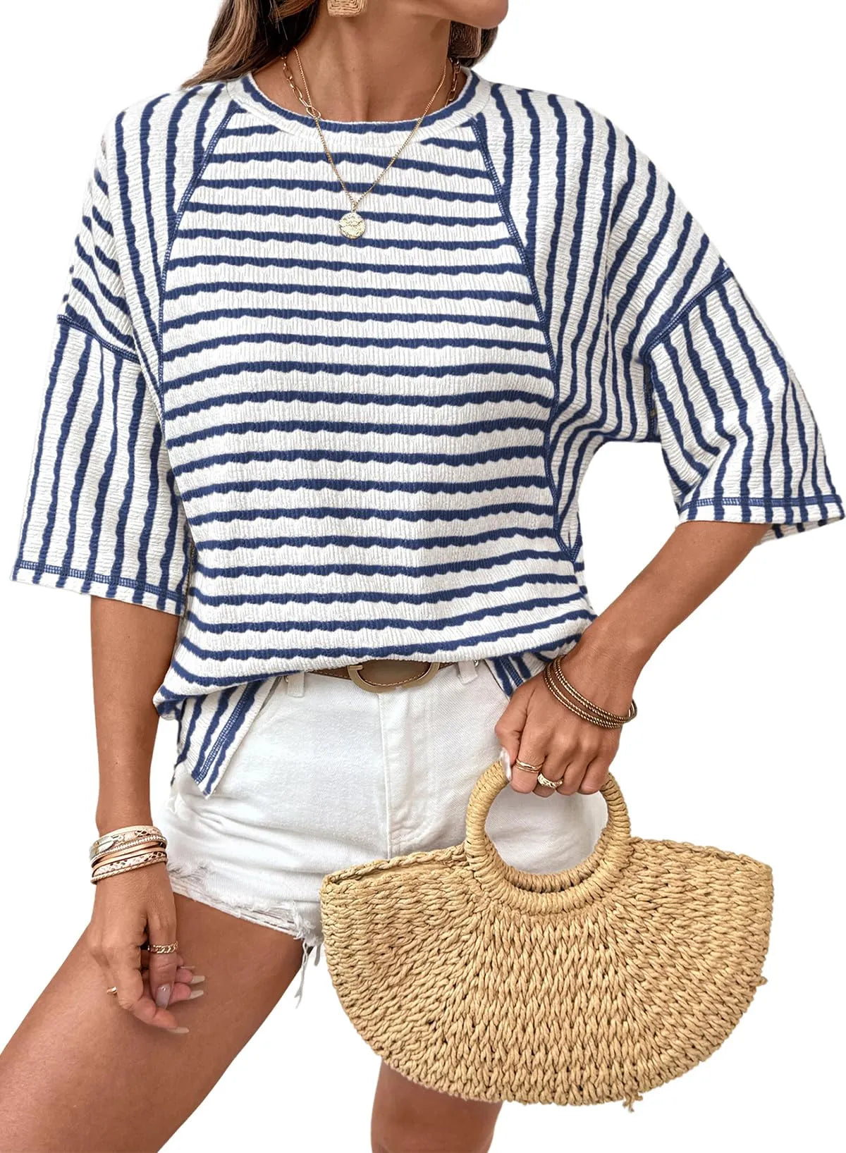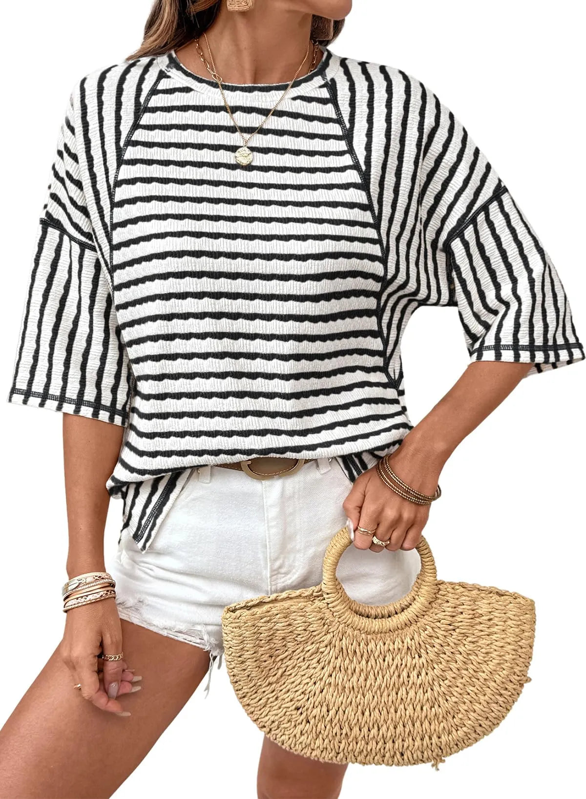 Enjoy all-day comfort and effortless style with our oversized tshirts for women. Featuring striped, color block, short sleeve, crewneck, side slits, texture, drop shoulder, soft and light weight, stretchy, solid color, this t shirt for women offers a loose fit that flatters every body type.