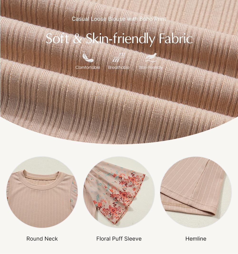 Boho-chic and effortlessly stylish, this blouse features floral patchwork flutter sleeves for a romantic, vintage vibe. Its stretchy ribbed fabric and loose fit make it a versatile staple for spring and summer outfits.