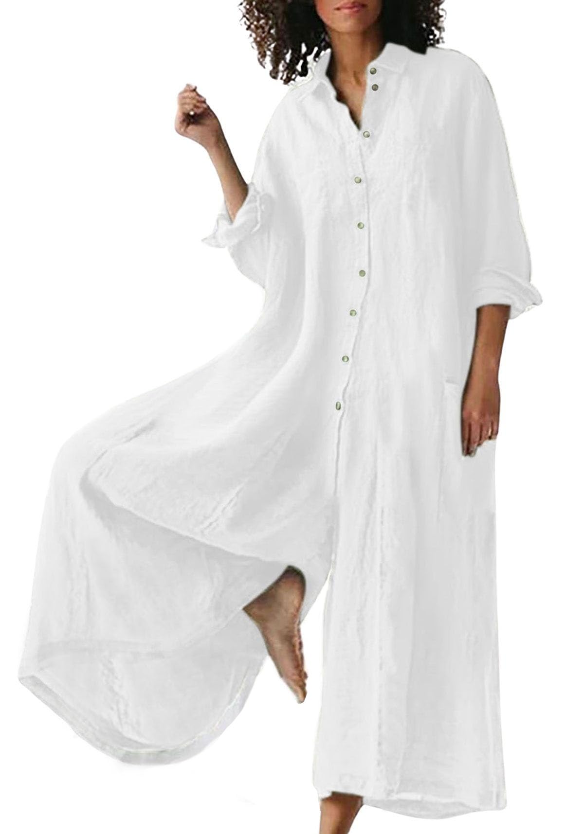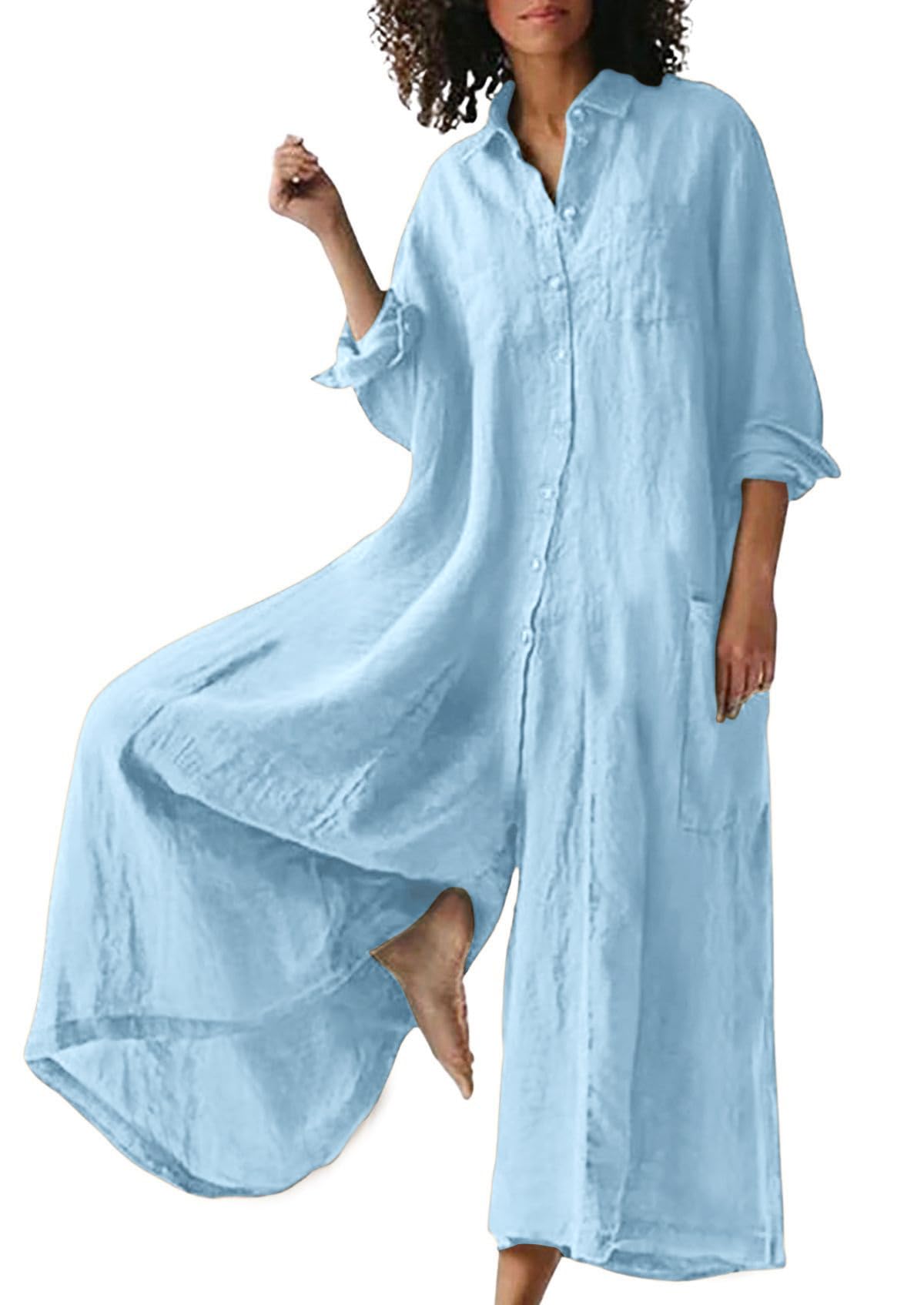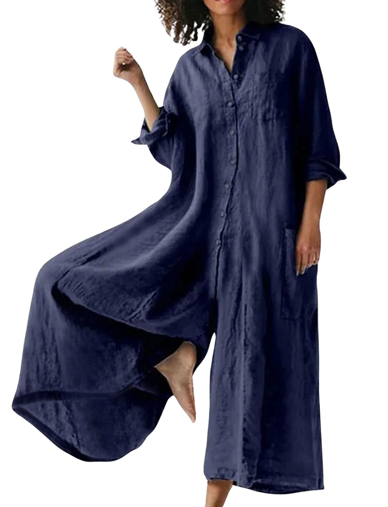 Women's Linen Button Down Long Sleeve Wide Leg Jumpsuit