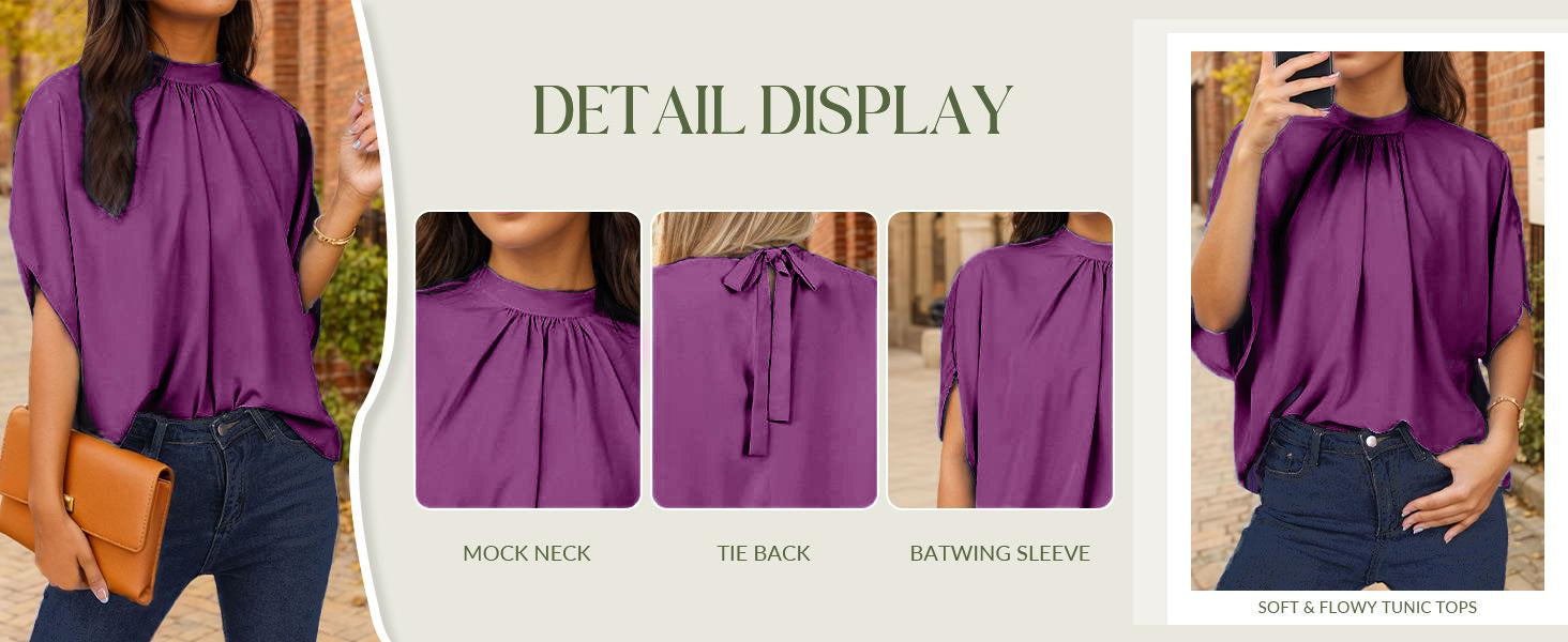 Elegant and dressy-casual, this mock neck blouse features flowy batwing sleeves and a tie-back detail for a flattering, feminine silhouette.