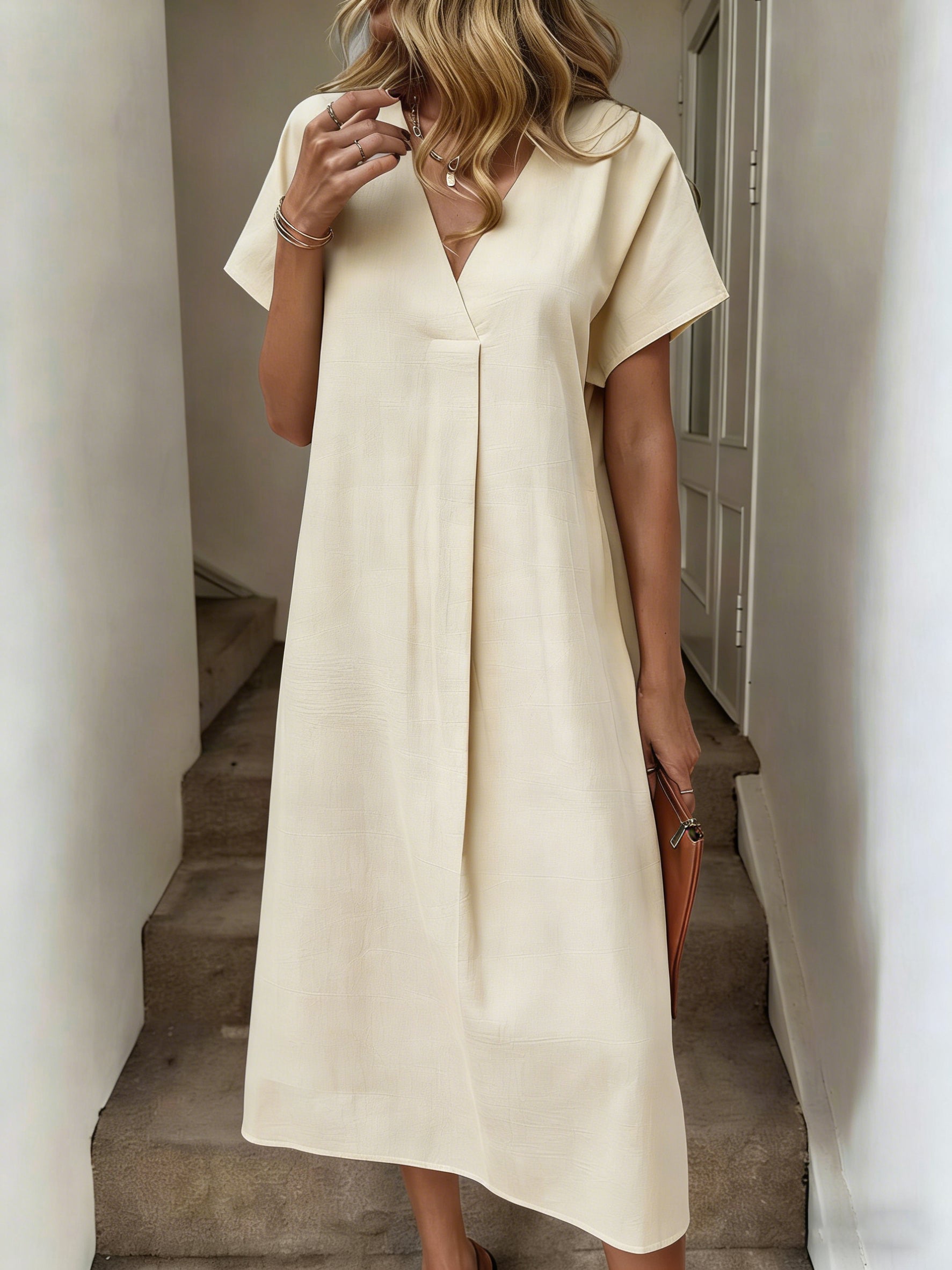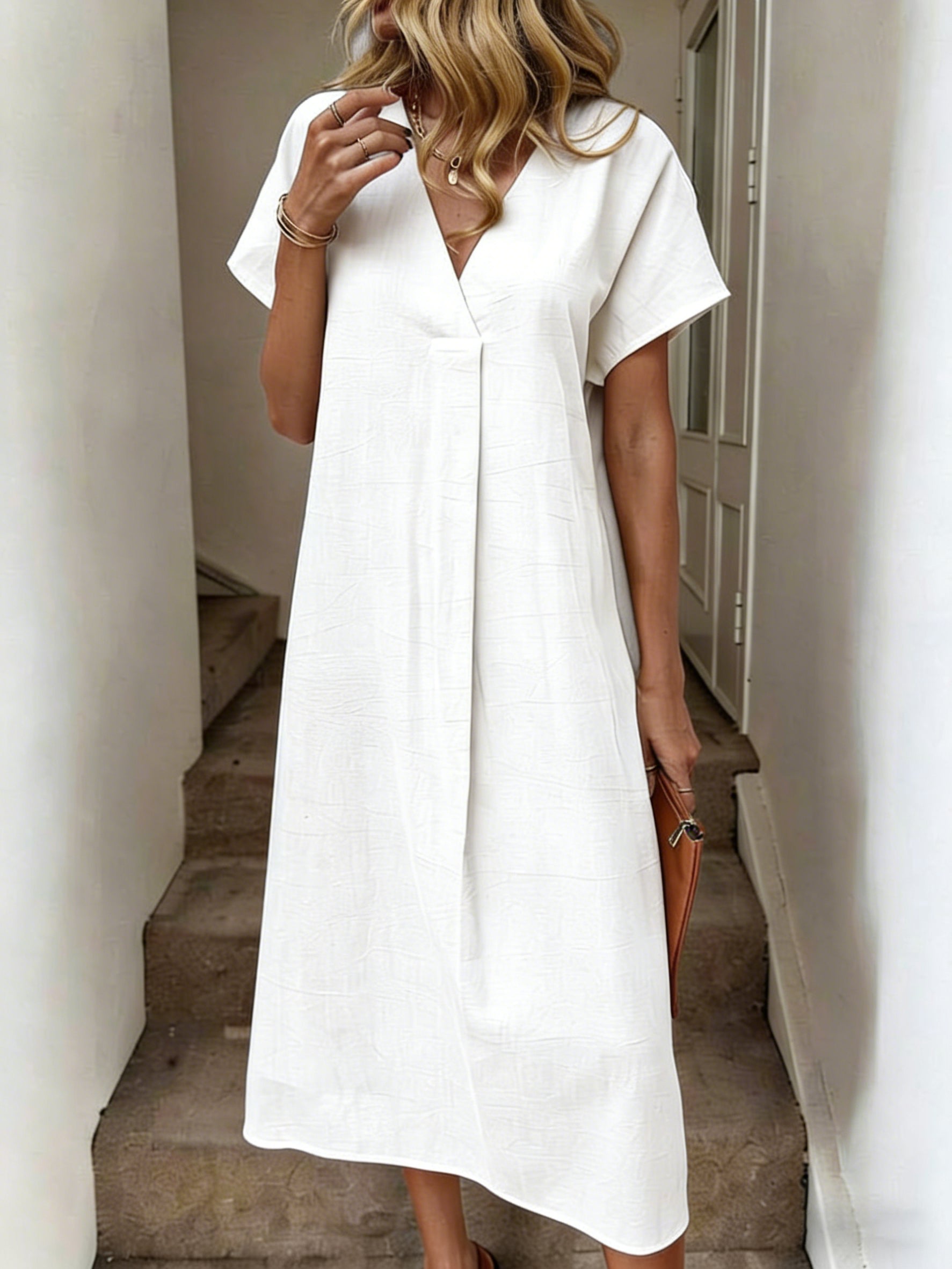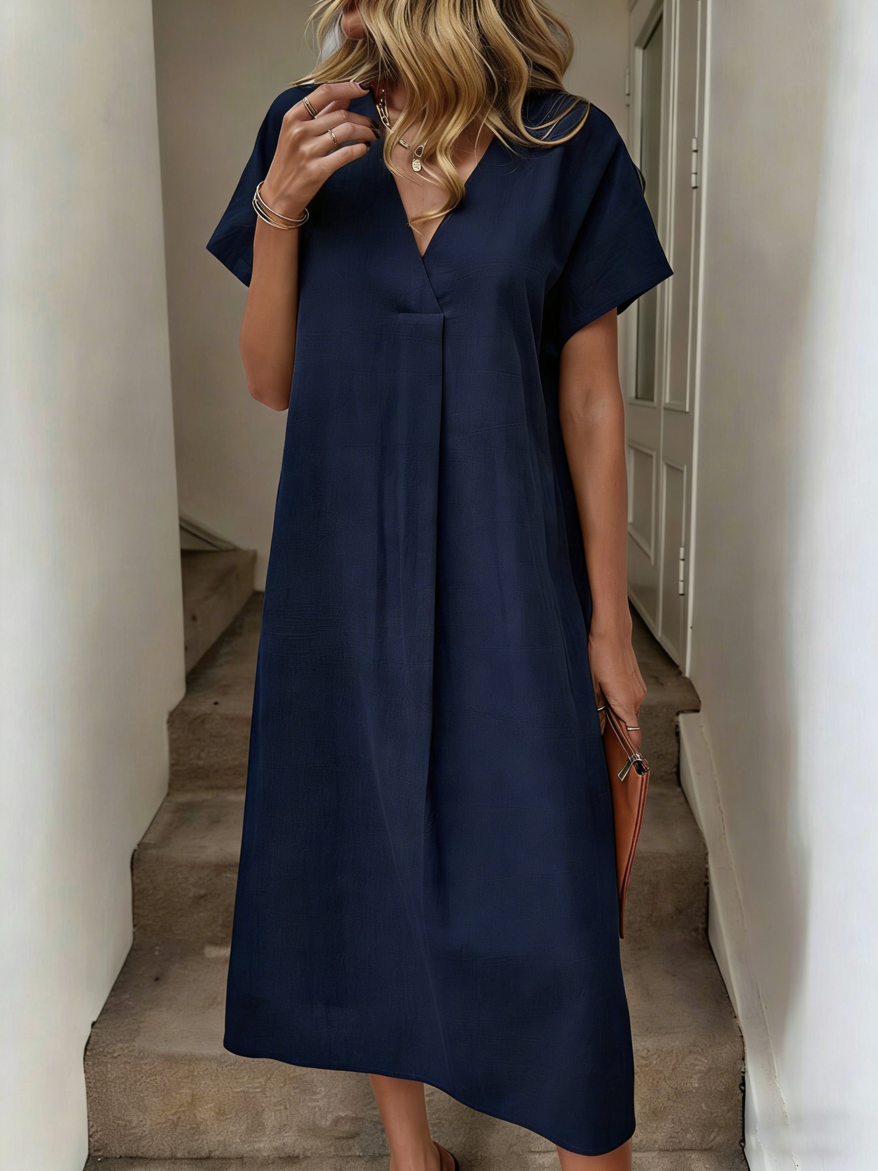Casual and relaxed, this solid cotton midi dress features a V-neck and raglan sleeves, perfect for effortless warm-weather styling.
